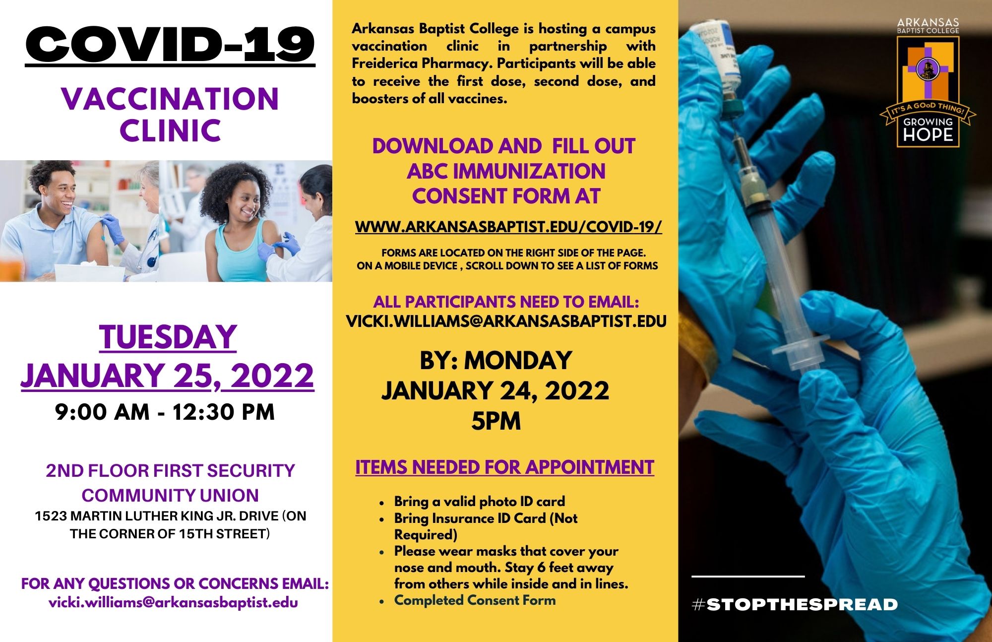 Arkansas Baptist College is hosting a campus vaccination clinic in partnership with Freiderica Pharmacy. Participants will be able to receive the first dose, second dose, and boosters of all vaccines.